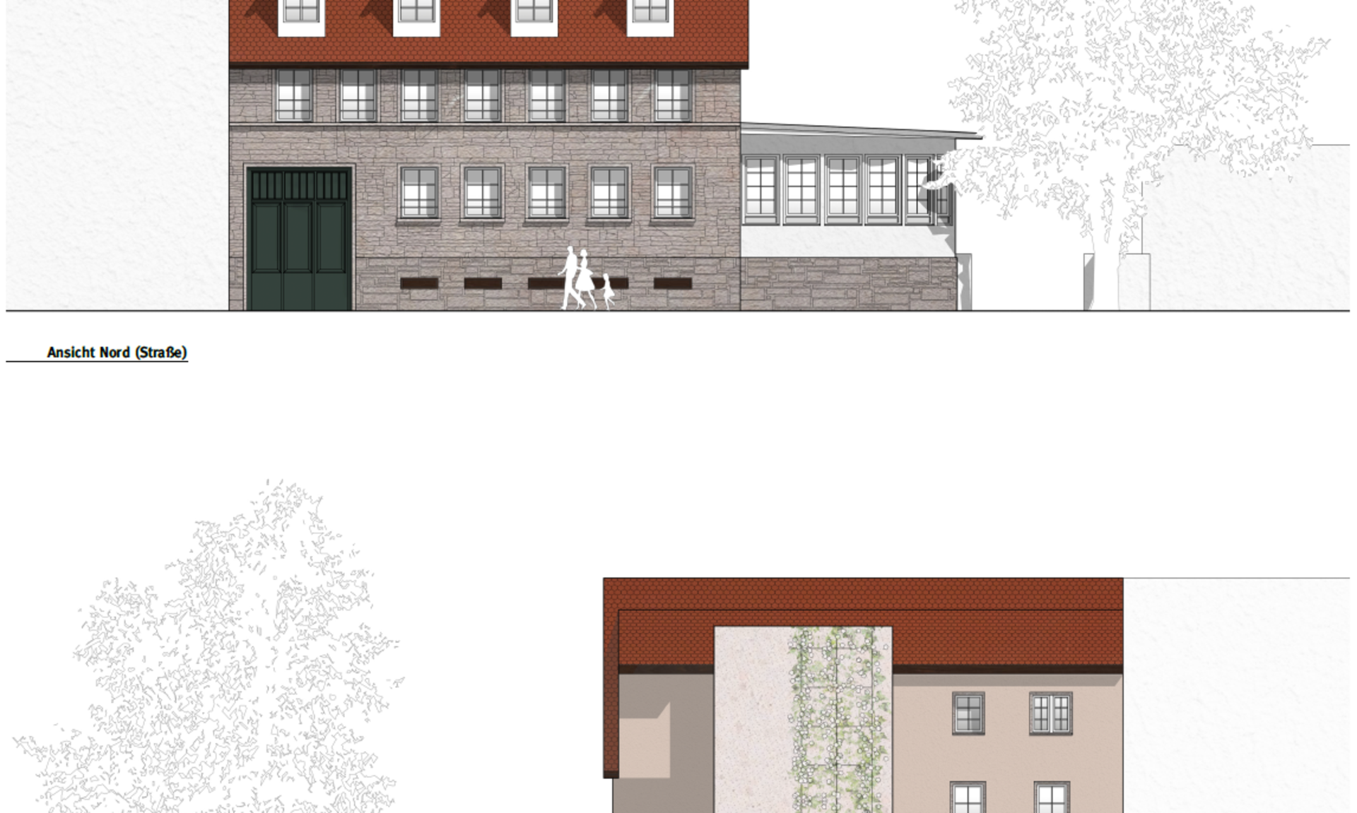 Die rückwärtige Gaube auf der Südseite bleibt erhalten, um die Nutzung des zweiten Obergeschosses weiterhin zu gewährleisten. Die Gebäudehülle wird energetisch optimiert, alle Fenster erneuert, die Dachflächen sowie die Fassaden auf der Innenseite bzw. im Süden auf der Außenseite gedämmt. Hierbei sind die Vorgaben des Denkmalschutzes zu berücksichtigen, um den historischen Charakter zu erhalten. Das sichtbare Mauerwerk auf der Straßenseite bzw. auf der Giebelseite im Westen bleibt erhalten und wird ausgebessert und verfugt. Bei der Sanierung der Fassade gab es enge Abstimmung mit dem Artenschutz. Entsprechende Quartiere für Mauersegler und Fledermäuse sind vorgesehen.